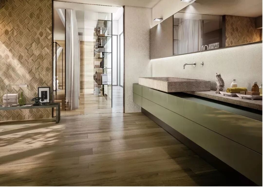 有一种调调,趋近于自然,永恒经典。它是木纹,无论是什么色系,总有其独特的气韵与美感,用于卫浴空间更显温馨淡雅。