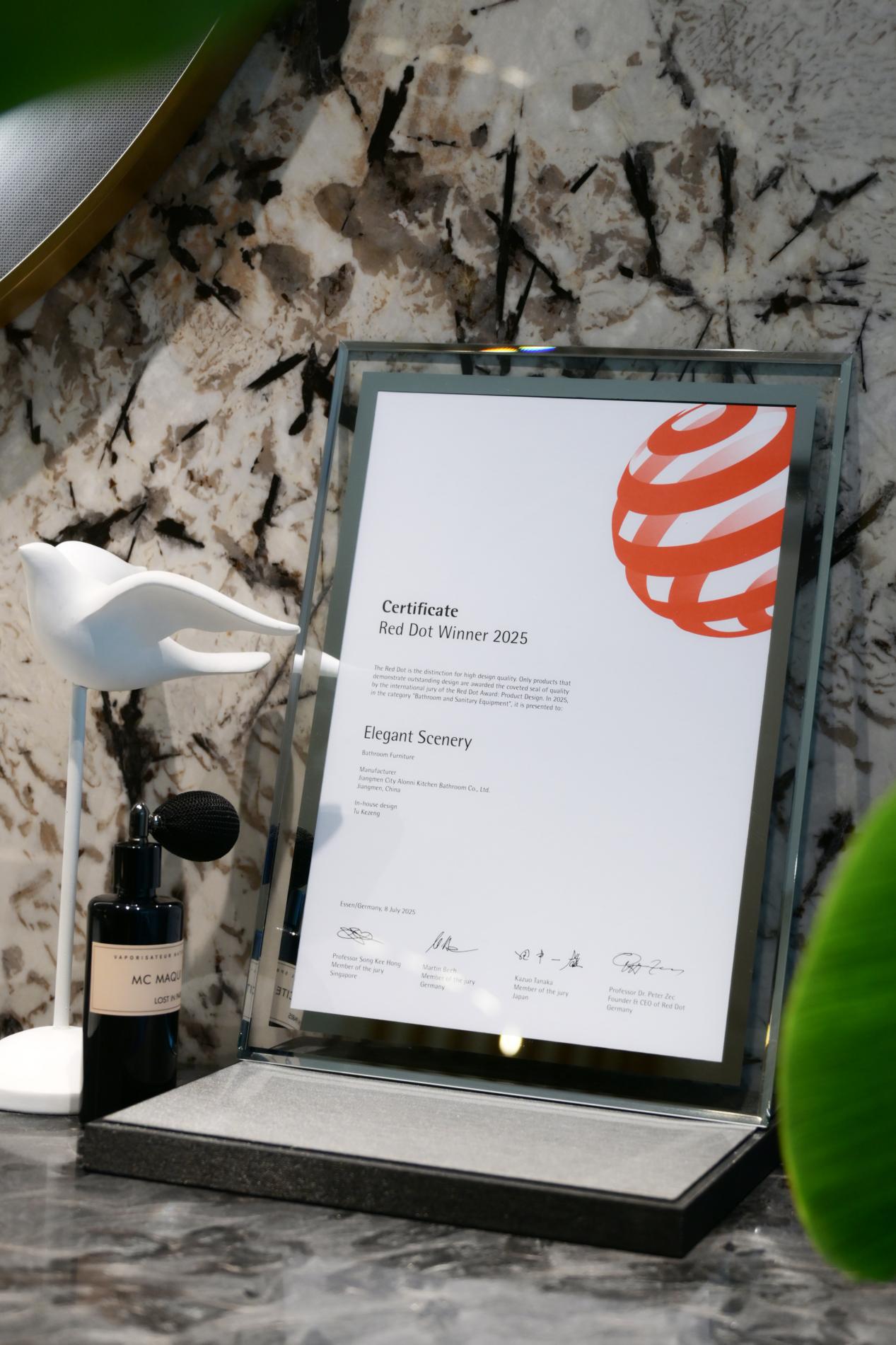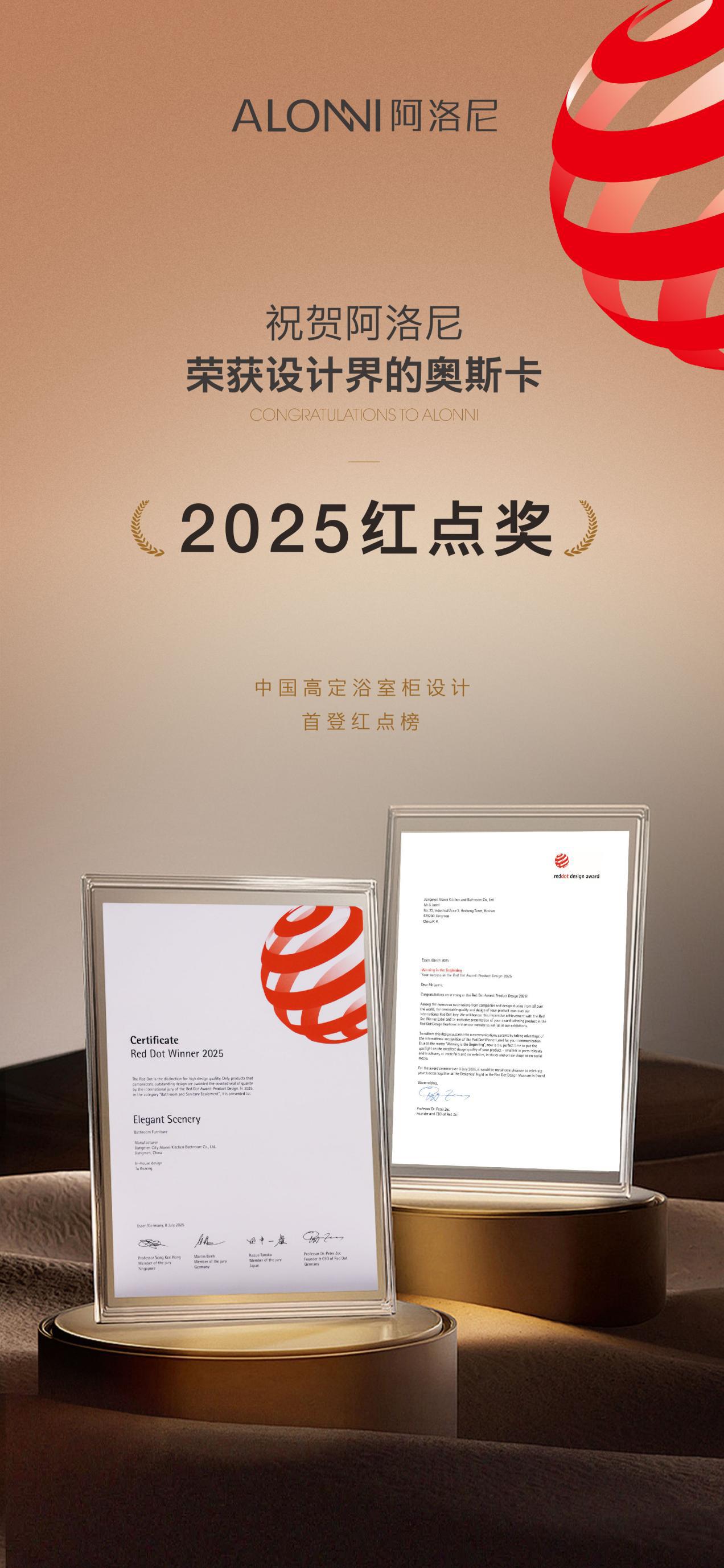德国红点设计大奖组委会的官方邮件与荣誉证书正式抵达阿洛尼总部!这标志着中国高定浴室柜品牌首次登上红点设计榜,实现了历史性的突破。