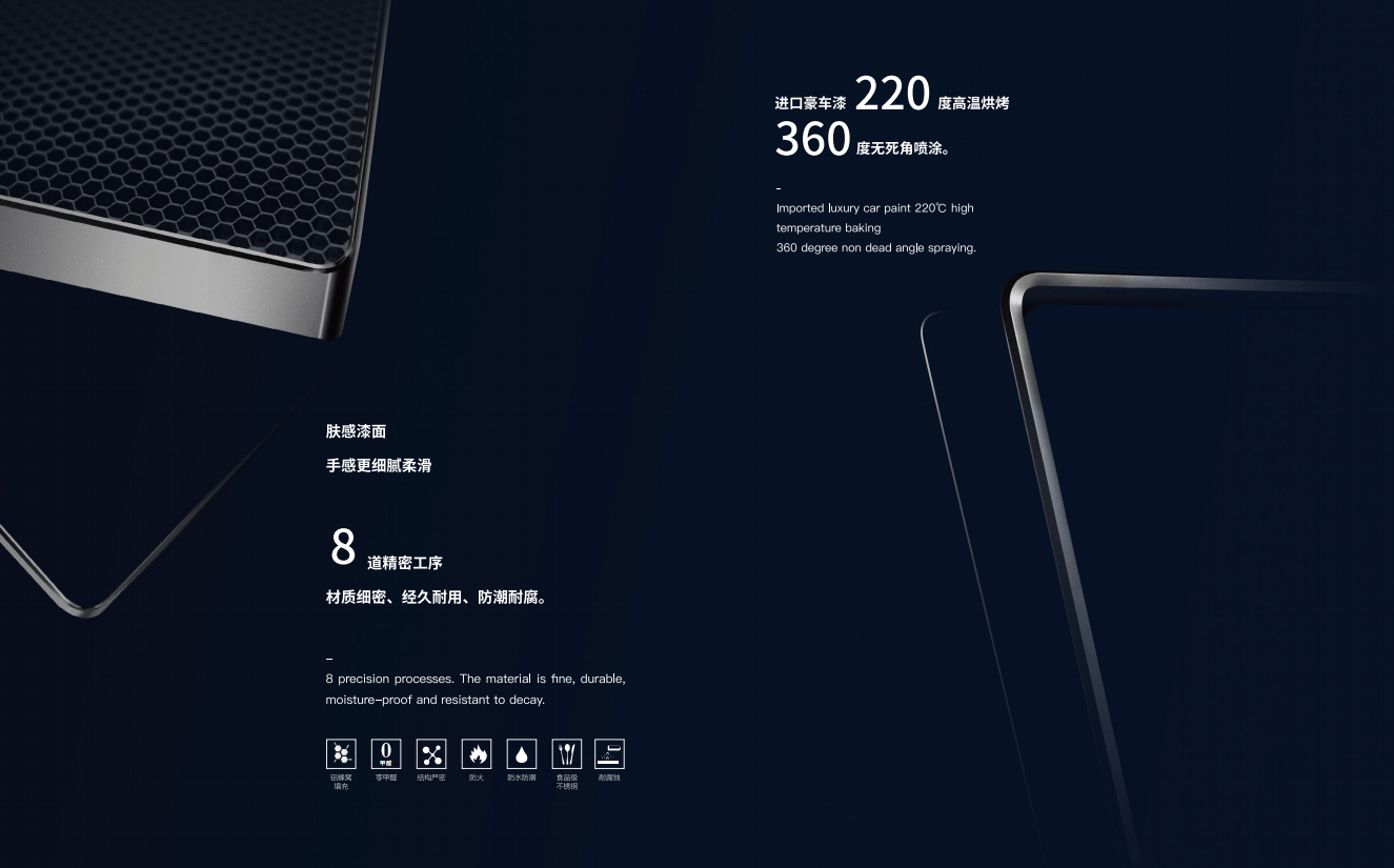 01全线产品采用足厚优质不锈钢基材,结合高温烤漆工艺,表面耐划伤、抗指纹且色彩持久。