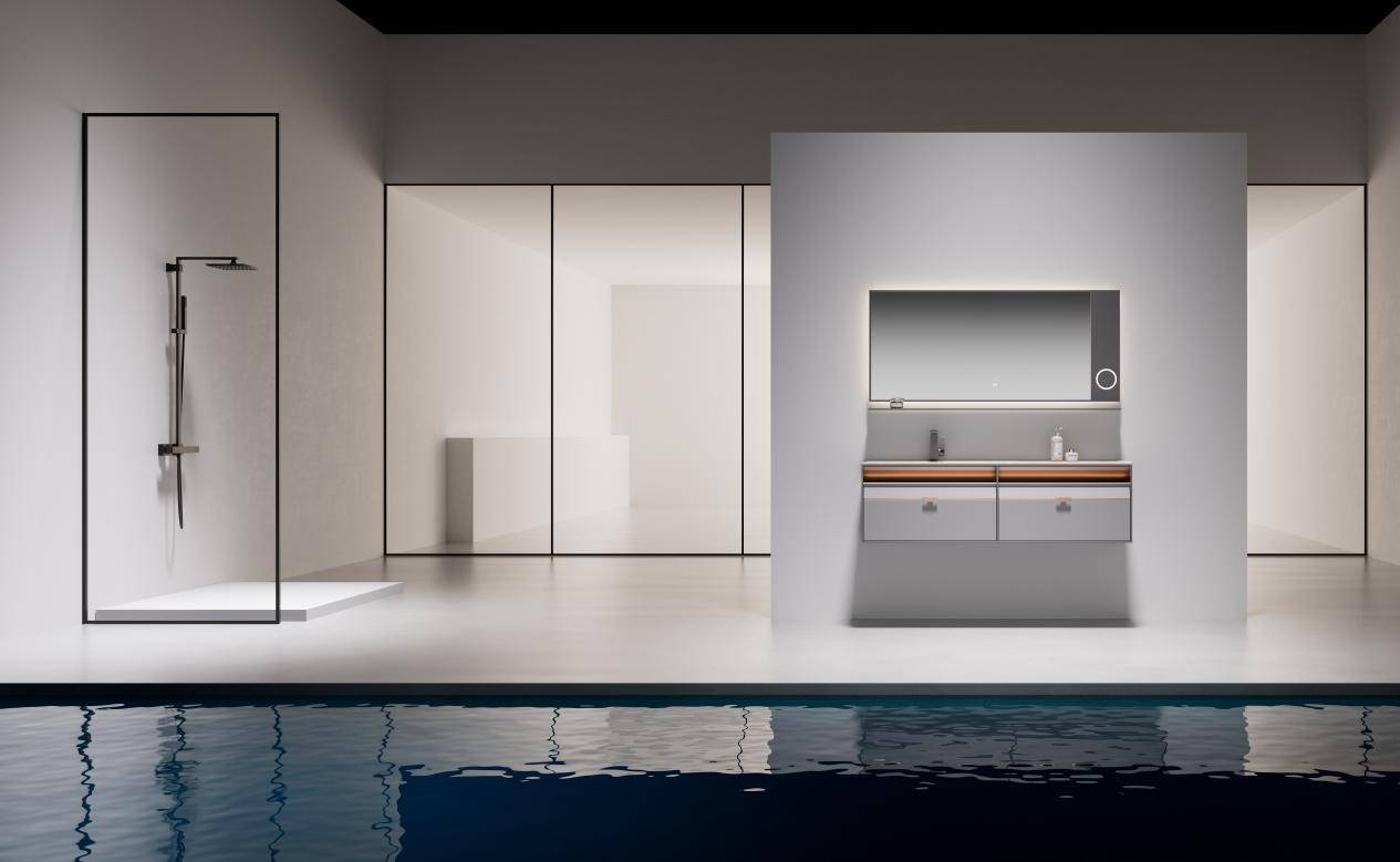 从一体成型的折弯技术,到300℃恒温静电下的无醛烤漆技术(硬度高达5H),再到纳米抗指纹涂层的精细处理,乾妃确保每一件产品都具备卓越的耐腐防锈性能,历久弥新。主材精选足厚优质不锈钢板材,柜体内部采用六边形铝蜂窝填充,结构稳固;智能镜采用环氧无铜环保镜 (常用于奢侈品家具),且智能镜全部与电路相关的部件均获得3C认证;搭配库博五金与满焊工艺,于细微处见证非凡品质。这些专利或专有技术的应用,是乾妃能够跻身高定浴室柜十大品牌之列的技术保障。
