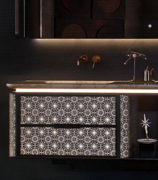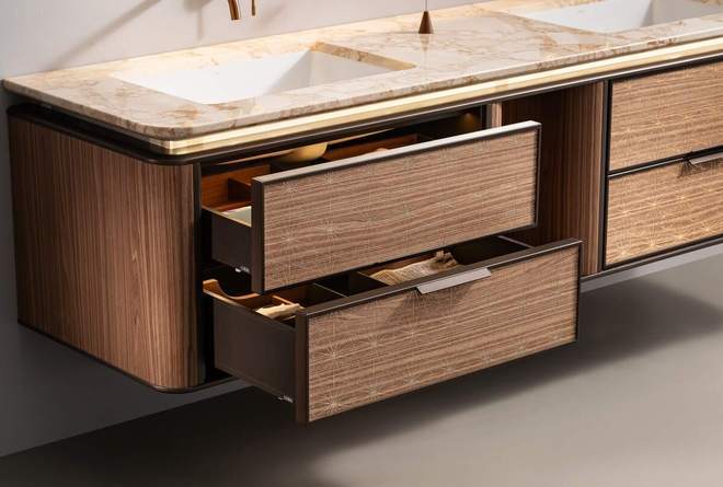 撷取东方宫廷窗棂与拼花美学,以现代设计语言转译。菱形三色木皮拼花,在严谨几何秩序中演绎色彩律动;深浅撞色处理,于柜体立面勾勒如景框般的立体层次。它将东方雅韵凝于当下,让浴室成为浸润文化意趣的宁静一隅。