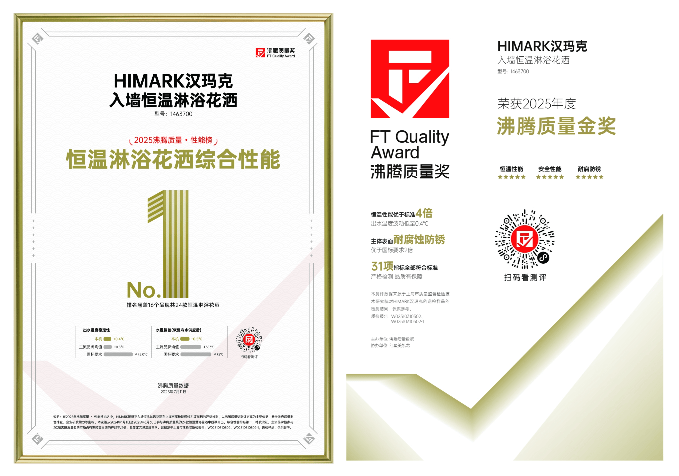 在被誉为“消费品质量奥斯卡”的2025沸腾质量奖评测中,汉玛克经历严苛考验,从80余家国内外品牌的近200款参评产品中脱颖而出,力压群雄,荣登“恒温淋浴花洒综合性能榜”榜首,并一举斩获至高荣誉“2025年度沸腾质量金奖” 。