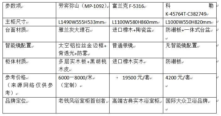 为更直观展现弥山的市场定位,选取高端实木浴室柜代表品牌富兰克、国际卫浴巨头科勒的热门型号进行参数对比: